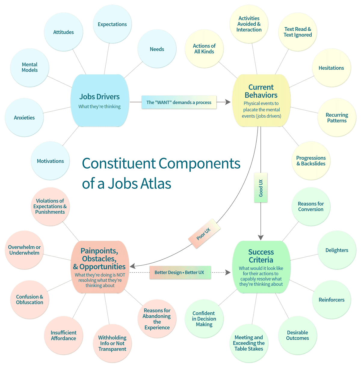 We took the qualitative data from the debriefing interviews and were able to define where the real culprit issue was. We do that by defining where the preponderance of their thought processes are focused (Jobs Drivers), what actions they are doing to try to satisfy the needs and motivations expressed in those thought processes (Behaviors), the reasons why those actions to not lead to the satisfaction of said needs and motivations (Painpoints, Obstacles, & Opportunities, and the delivery worker's ultimate vision of the optimal scenario outcome (Success Criterion). The resulting Jobs Atlas, tells us where to focus, what tactical strategies are more likely to be efficacious, and what has to happen in order for the delivery workers to perceive it as a good user experience.